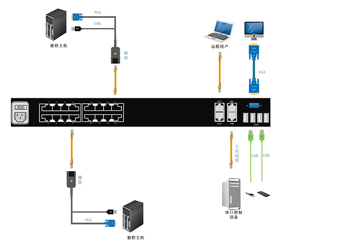 支持PS/2, USB, Sun Legacy(13W3)及串口(RS-232)连接功能